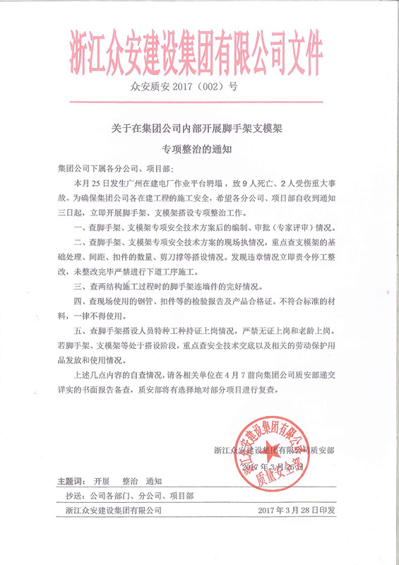 關于在集團公司內部開展腳手架支模架專項整治的通知