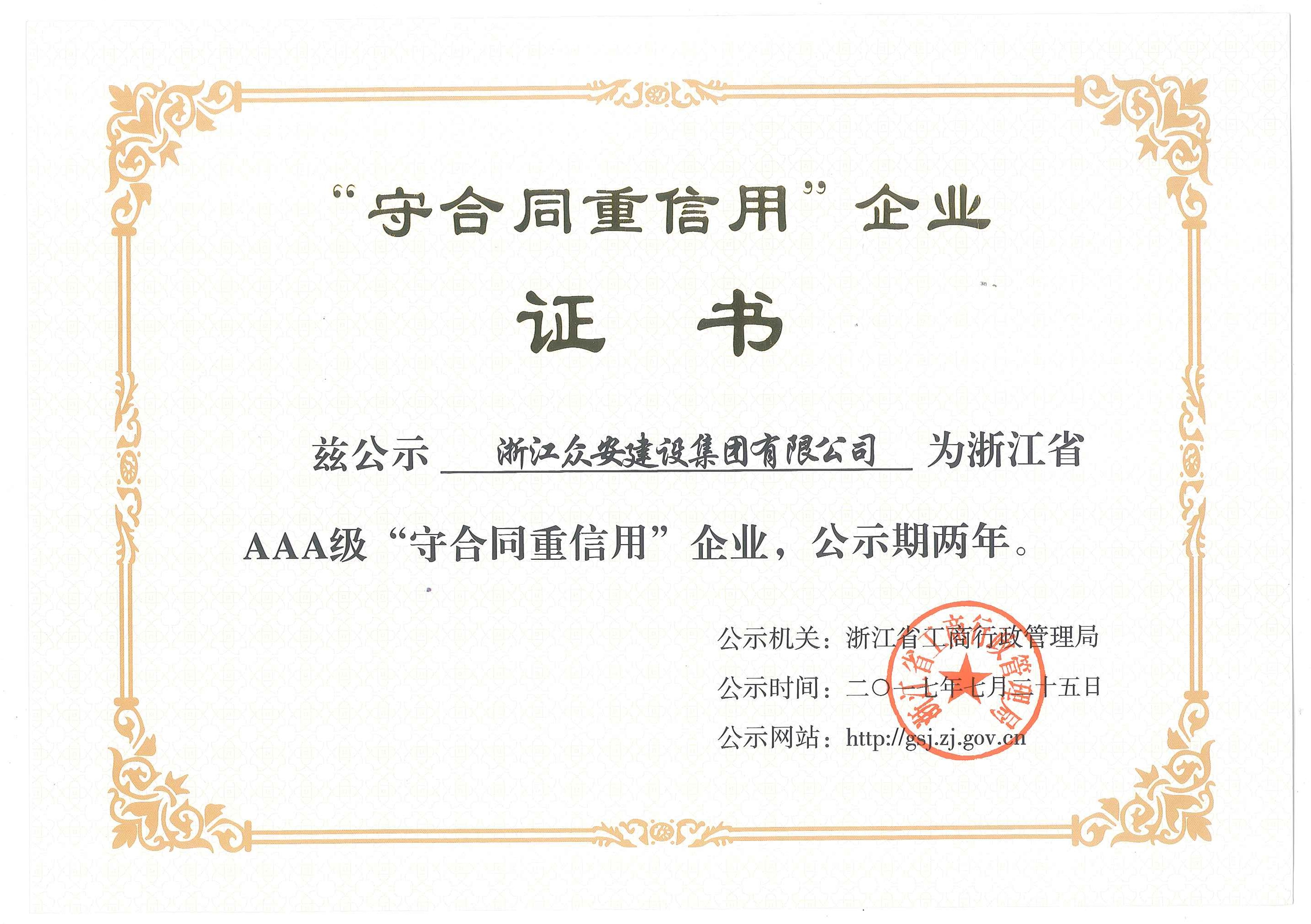 集團(tuán)榮獲“AAA”級守合同重信用企業(yè)!浙江眾安建設(shè)集團(tuán)有限公司 發(fā)布時間:2017-08-23   點(diǎn)擊瀏覽:5548次