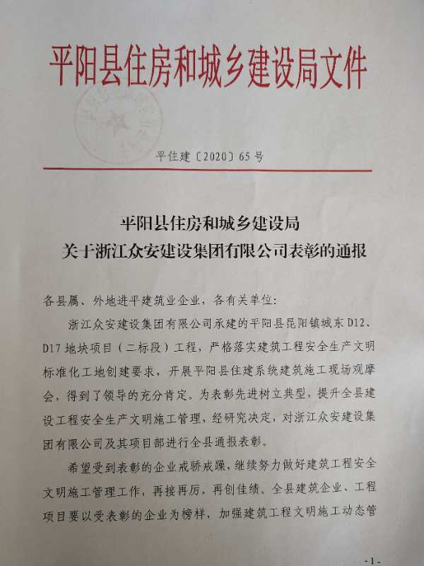 熱烈祝賀集團承建的溫州市平陽縣昆陽鎮城東D12、D17地塊(二標段)項目獲溫州市平陽縣住建局通報表彰。浙江眾安建設集團有限公司 發布時間:2020-09-01   點擊瀏覽:4958次