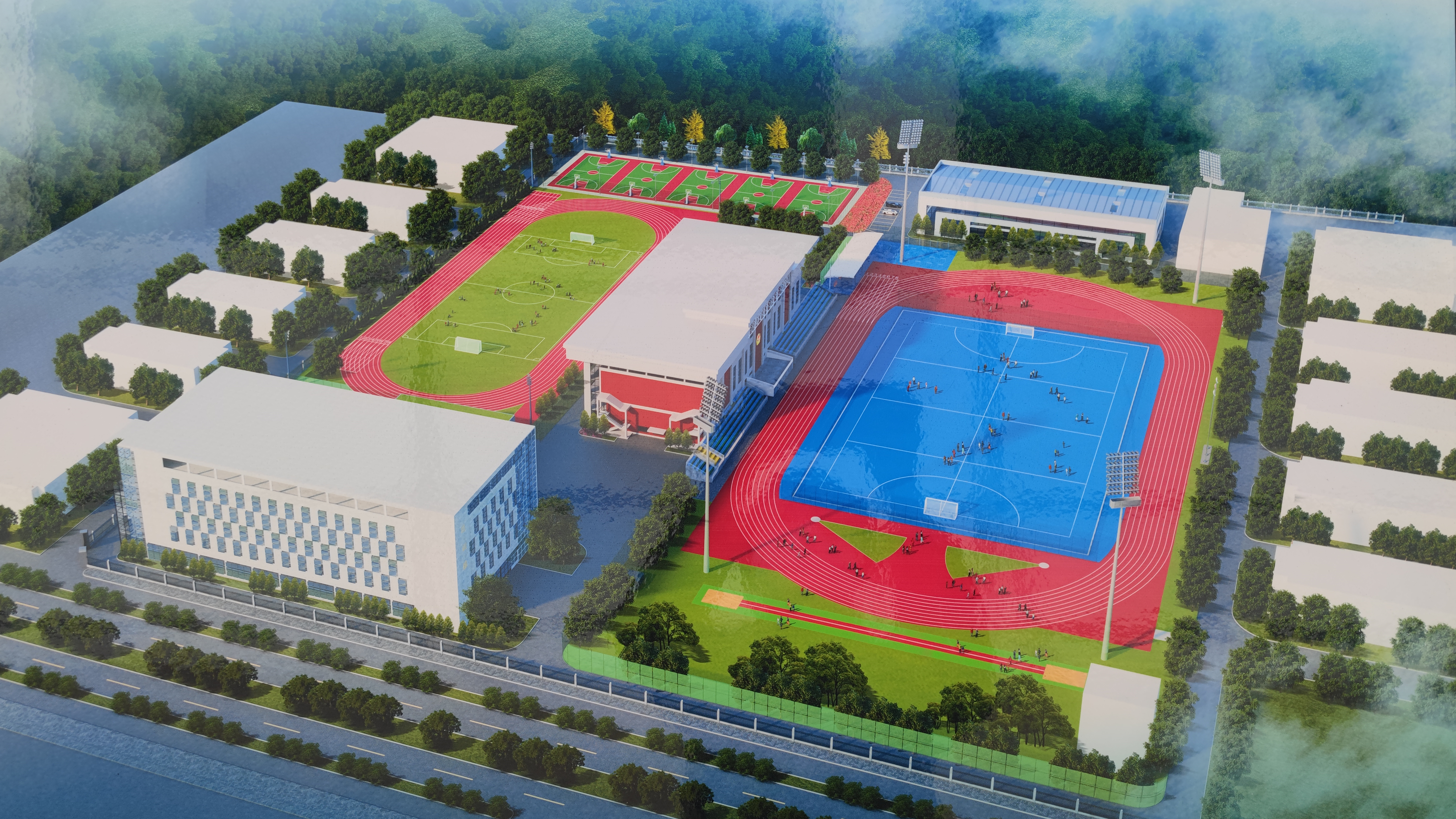 曲棍球訓練場是對學校原運動場進行改建,包括鋪設曲棍球專用人工草坪、噴灌排水設施改造、塑膠跑道提升改造、照明系統改造、增設圍網等;并布局功能用房,增設無障礙設施、醫療室、運動員休息室、監控室、訓練房及工作人員辦公室等。