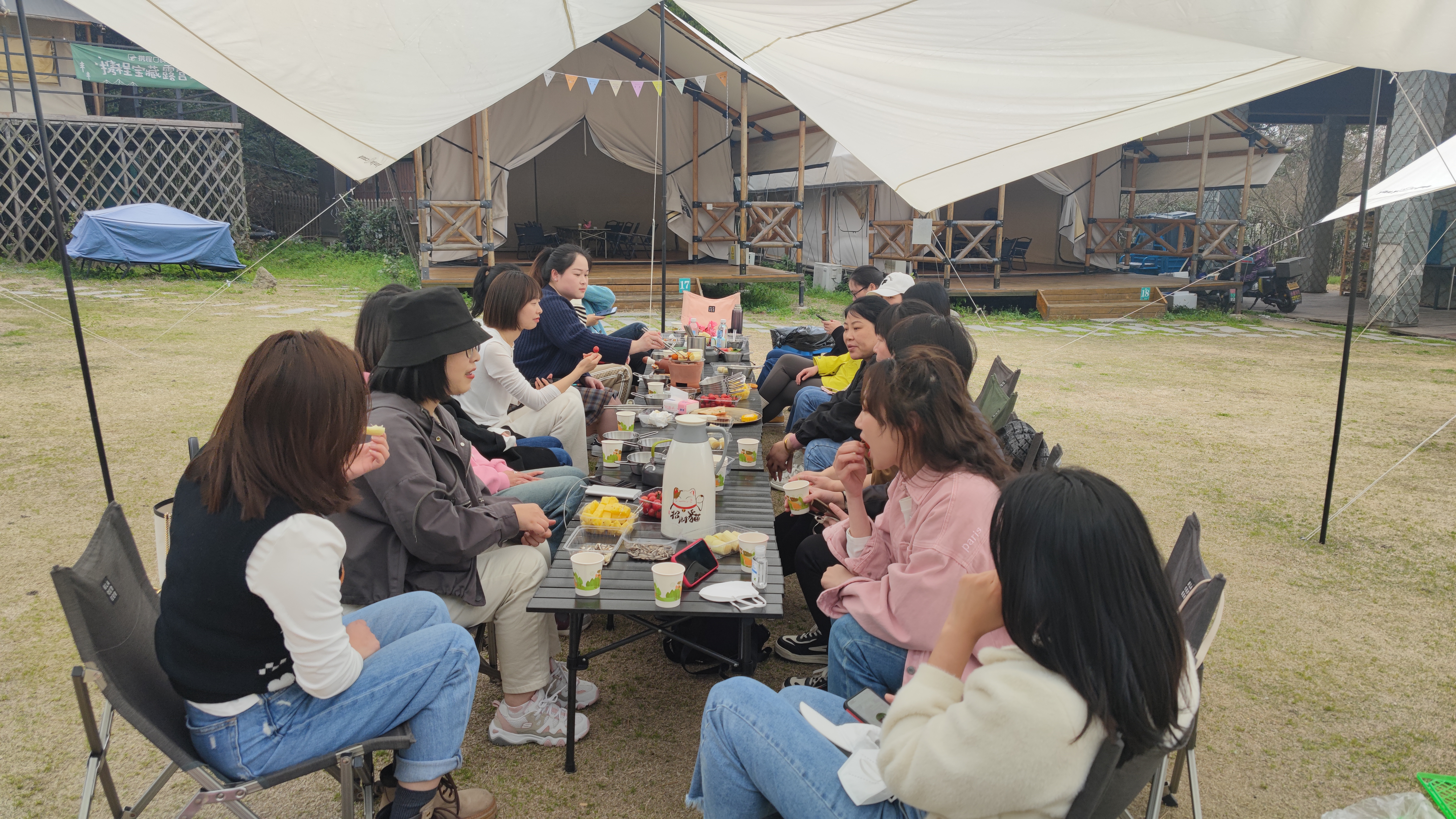 到達露營地后,女員工們先在草坪漫步、欣賞美景,盡情放松身心。接著營地提供的茶水、點心準備就緒,大家紛紛就坐,享受著圍感拉滿的圍爐煮茶和工會為大家精心準備的水果、飲料和小零食。