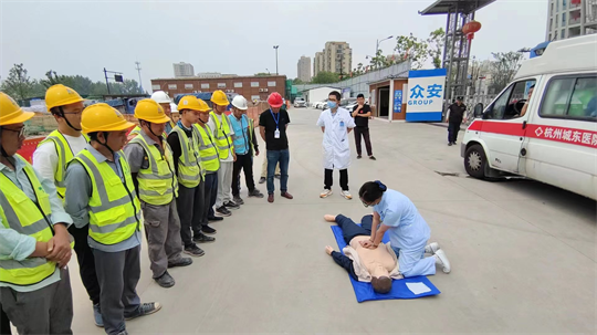 在演練之前,工管中心安全負責人向大家說明了消防安全的重要性和本次演練活動的流程。市城東醫院應急救援部醫生以圖文并茂的形式向大家講解了高空墜落、物體打擊后對人員的急救方法,以及防中暑、防中毒等相關急救知識。隨后,圍繞安全生產月主題“人人講安全,人人會應急”,組織開展了事故報告、事故急救、心肺復蘇救援以及120急救等活動。